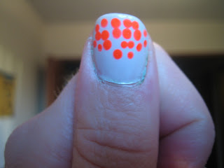 so after i got all the dots i went upstairs to more overhead light to notice that the China Glaze Japanese Koi i thought i bought was actually China Glaze Neon Orange. Kinda disappointed it was not the Japanese Koi. Guess that's my fault for not checking the bottom of the bottle in Sally's. The pinky is a mini dot swatch to compare the Neon Orange to my OPI Brights Power. In the bottle they looked similiar but on the base of grey not so similiar at all.